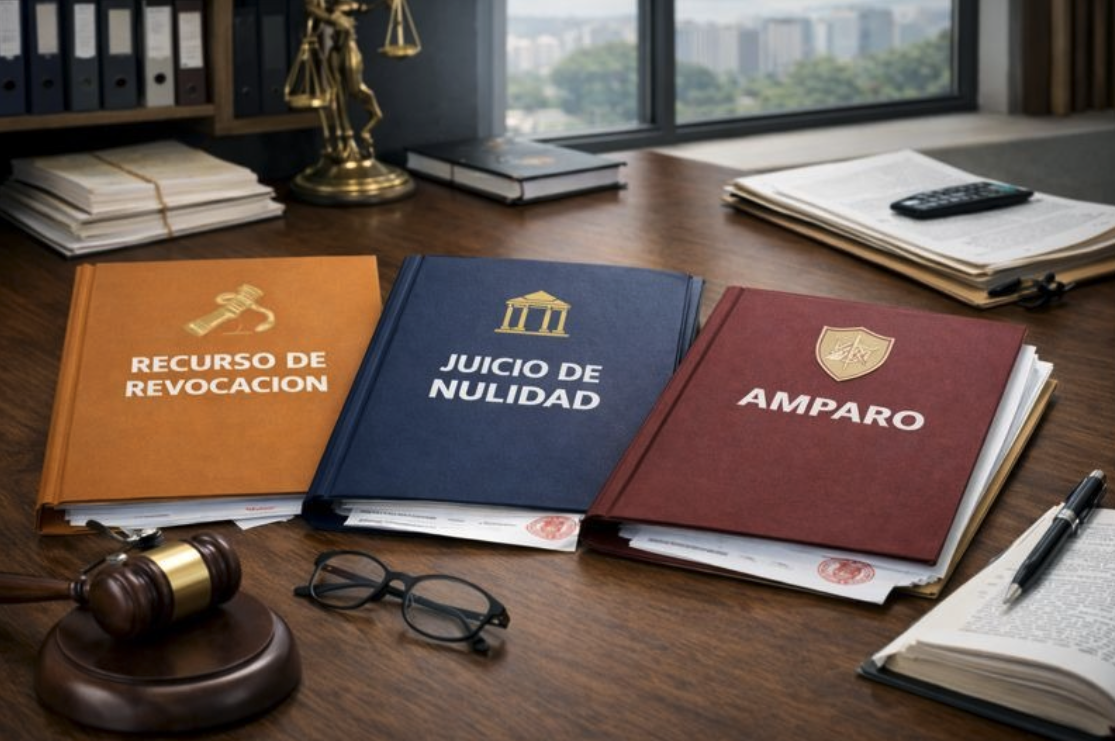 Interposición de medios de defensa (Recurso de revocación, Juicio de Nulidad y Amparo).